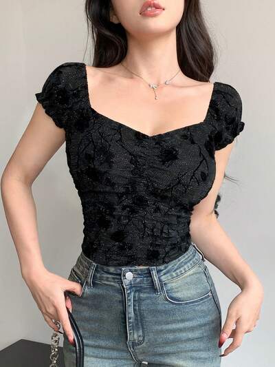 Camiseta de estilo vacacional de manga corta, ajustada, con cuello cuadrado, de tela con textura brillante y estampado flockado para mujer