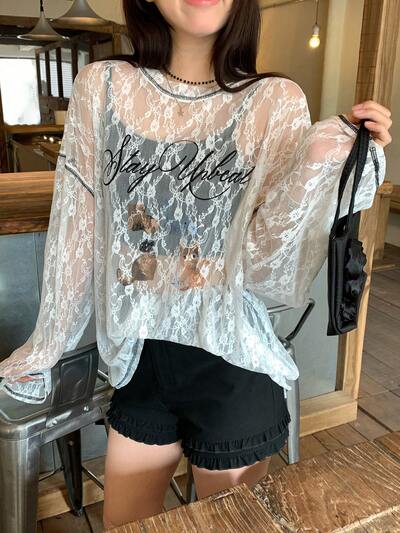 Blusa de mujer con cuello en V y mangas largas de encaje, adecuada para banquetes, vuelta al colegio, Día de San Valentín, transparente, ropa de otoño para el Día de San Valentín
