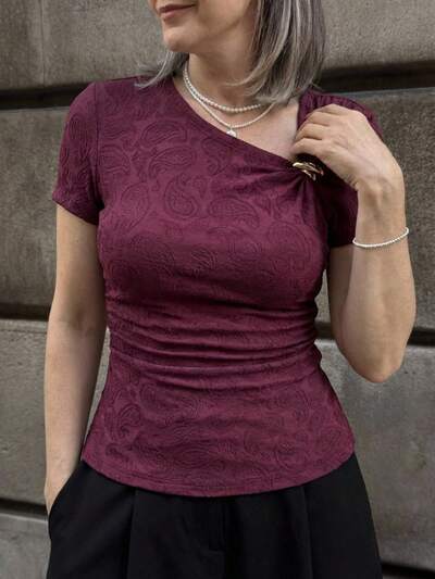 Camiseta de manga corta de verano para mujer con cuello redondo, estampado de letras y números, diseño plisado y retorcido, versátil y casual para uso diario