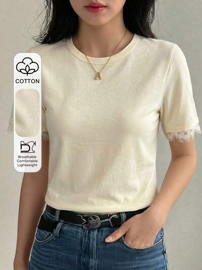 Camiseta casual holgada de mujer con cuello redondo, manga corta y encaje de contraste