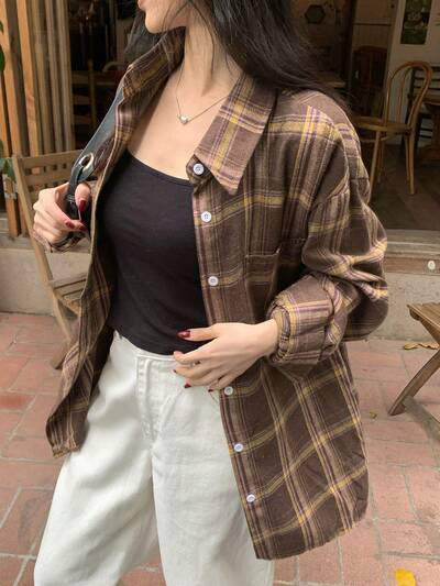 Camisa casual de mujer de manga larga con botones y estampado de cuadros, para el verano