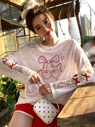 Blusa de encaje blanco de estilo coreano de manga larga y transparente, top holgado, apropiado para camisetas gráficas de principios de otoño para mujeres