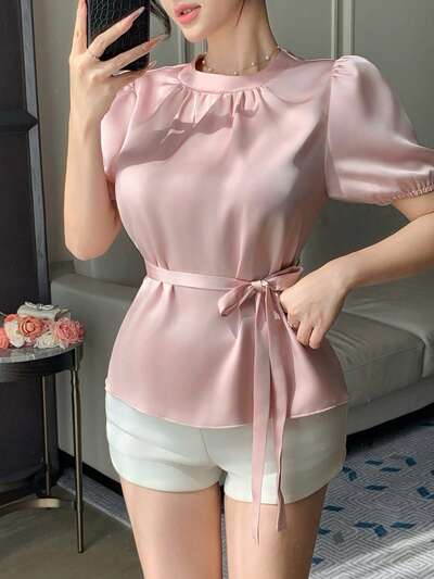 Camisa de mujer de manga corta con lazo en rosa