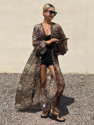 Camisa transparente de manga farol con estampado de leopardo marrón para mujer, conjunto de vacaciones de verano bohemio