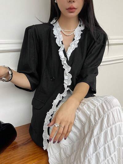 Camisa de verano casual para mujer con bloque de color y volantes de lino-60%