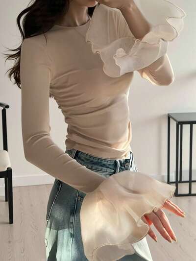 Vestido/Camiseta elegante con volantes para mujer con mangas acampanadas, encaje y parches, ideal para fiestas y el Día de San Valentín en primavera/verano