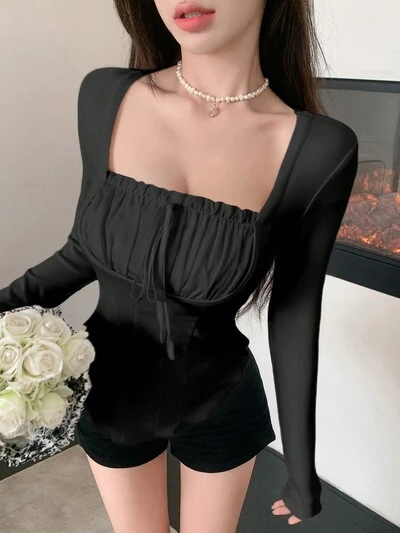 Camiseta de manga larga con cuello cuadrado sexy, camiseta interior con cuello de pico que estiliza la figura para mujeres