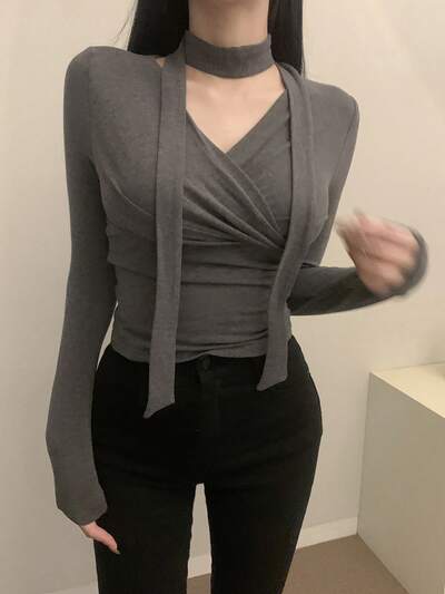 Camiseta de manga larga con cuello en V, cruce y lazo, estilo coreano, elegante para otoño/invierno