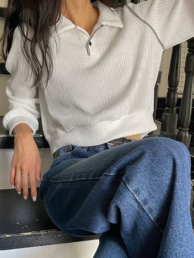Camiseta casual de manga larga con cuello de polo, corta, unicolor, para mujer, primavera y otoño