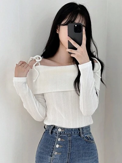 Camiseta de tirantes descubiertos para mujer, de unicolor y manga larga, casual y de moda para uso diario, ropa de otoño