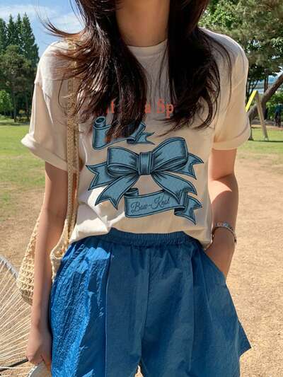 Camiseta holgada de manga corta con estampado de lazo para mujer, camiseta gráfica de verano primavera, top lindo para mujer, profesora-65%