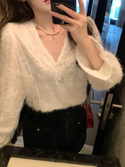 Blusa blanca de mujer con cuello en V y mangas acampanadas, de tela texturizada, para primavera/verano/otoño, con volantes
