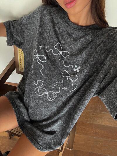 Camiseta gráfica de mujer de manga corta con cuello redondo, estampado de lazo, tela desgastada, holgada y casual de verano-45%