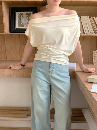 Blusa casual de mujer de manga corta con hombros descubiertos y plisados de unicolor