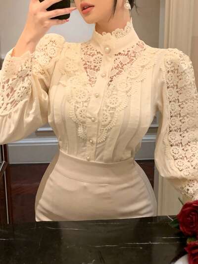 Camisa de mujer con cuello alto, empalmada con encaje, de unicolor, de manga larga, con volantes, ropa de otoño-43%