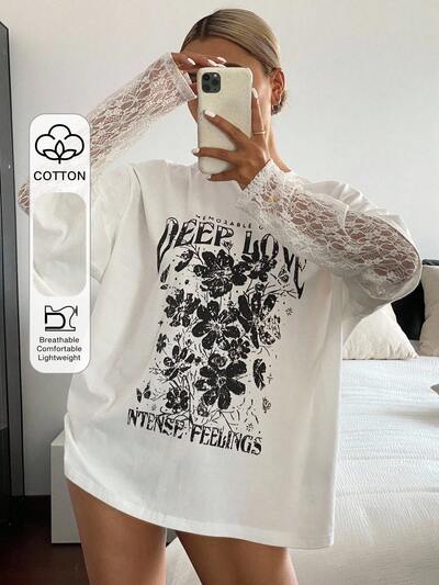 Camiseta de verano holgada y casual con estampado de letras y encaje en contraste, camiseta gráfica oversize con estampado floral