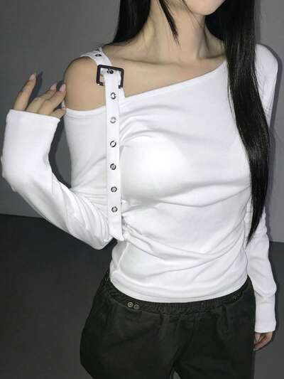 Camiseta de manga larga con cuello oblicuo, hebilla, ajuste ceñido y hombro asimétrico, de estilo casual para primavera