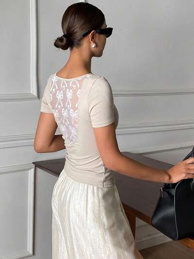 Camiseta interior elegante de manga corta, cuello redondo y ajuste ceñido con encaje de contraste para mujer, primavera/otoño