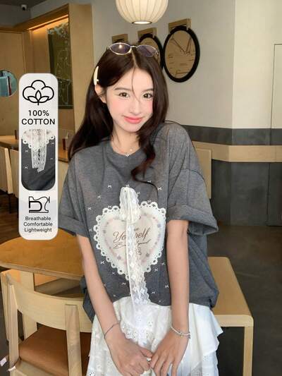 Camiseta de manga corta con estampado de corazón y lazo para mujer, camiseta casual de verano para chicas