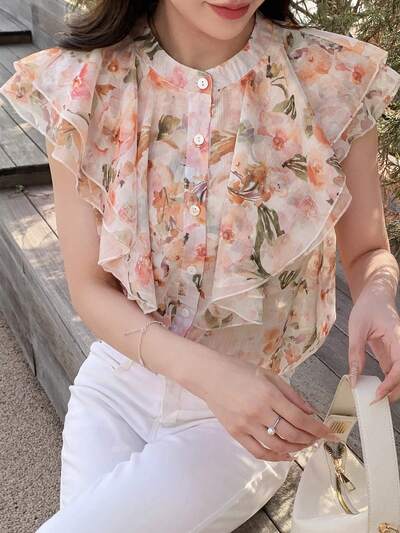 Blusa con botones y volantes con estampado floral, atuendos de vacaciones de otoño para mujeres, estilo bohemio de Pascua-43%