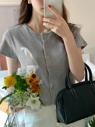 Camiseta de manga corta ajustada de cuello redondo de unicolor para mujeres, gris, primavera/verano