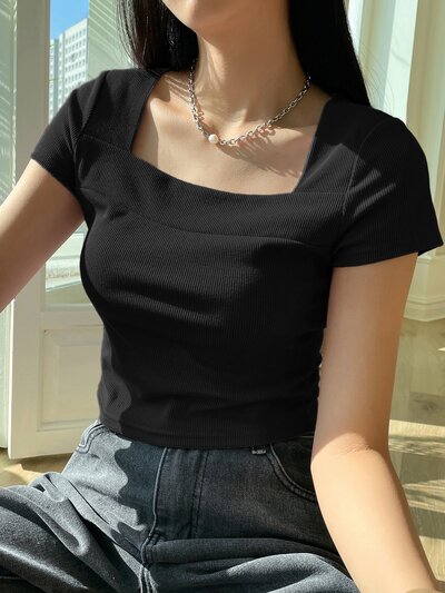 Camiseta de cuello cuadrado de punto acanalado de verano, blusas cortas para mujeres-43%