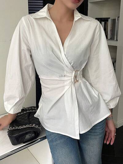 Blusa casual y elegante de manga larga con cuello oblicuo y solapa, unicolor, para otoño-50%