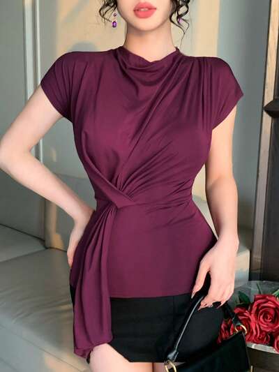 Blusa de verano de mujer con cuello asimétrico drapeado y unicolor elegante