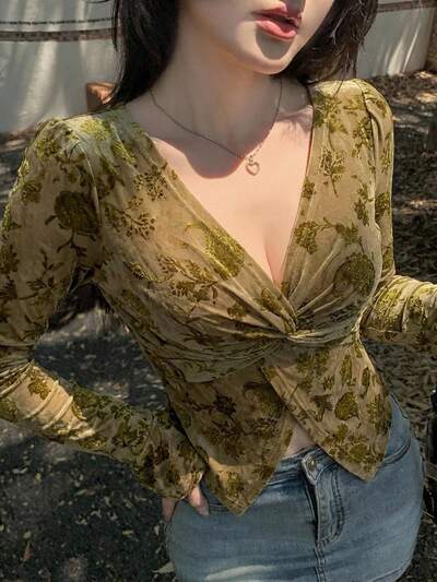 Camiseta de mujer con mangas acampanadas de malla con estampado floral retro elegante para salir