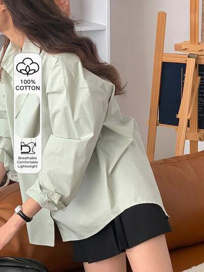 Camisa de manga larga con cuello vuelto, abertura en la espalda y unicolor holgada para mujer, color verde menta, ropa de primavera/verano/otoño, blusas estilo universitario