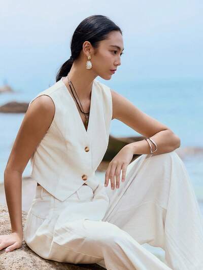 Conjunto de verano informal de mujer con top corto de cintura ceñida y escote en V sin mangas, y pantalones de pierna ancha