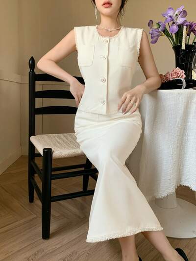 Set de 2 piezas de chaleco y falda en bloque de color para mujer-27%