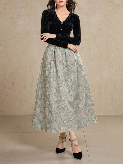 Conjunto elegante de 2 piezas con top corto de manga larga con diseño de botones de unicolor y falda de jacquard