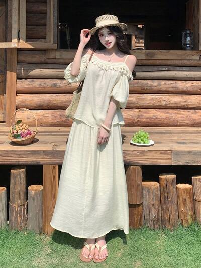Conjunto de 2 piezas para mujer: Top de lino con hombros descubiertos y flecos, y falda, para primavera/verano