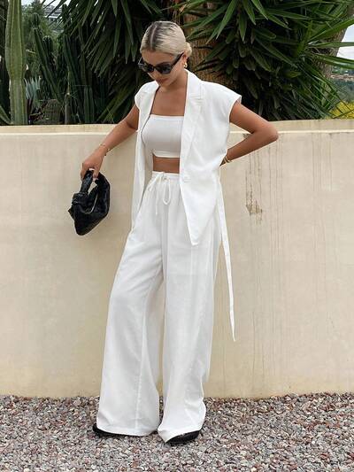 Conjunto de 2 piezas de pantalones rectos holgados de unicolor y blazer, estilo casual de vacaciones para primavera/verano para mujer
