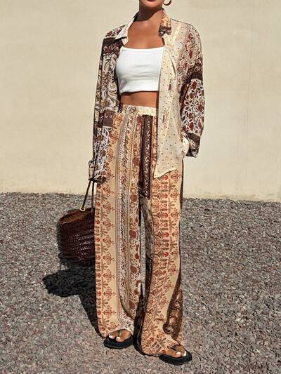 Conjunto casual de verano de 2 piezas con camisa de manga larga holgada con estampado floral y pantalones de pierna ancha para vacaciones, estilo bohemio