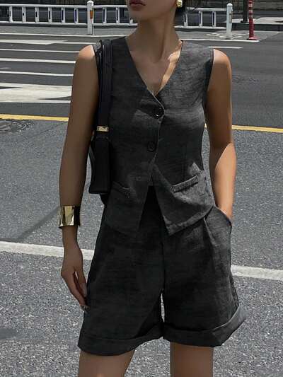 Set de 2 piezas con top sin mangas de cuello en V con cintura ceñida y pantalones casuales para mujer