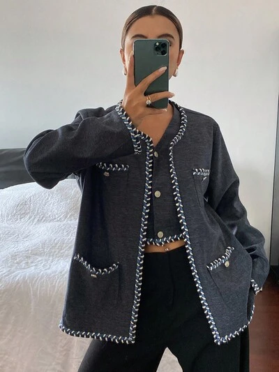Conjunto de 2 piezas de chaleco sin mangas con cuello en V y encaje elegante + chaqueta holgada de manga larga, para otoño/invierno
