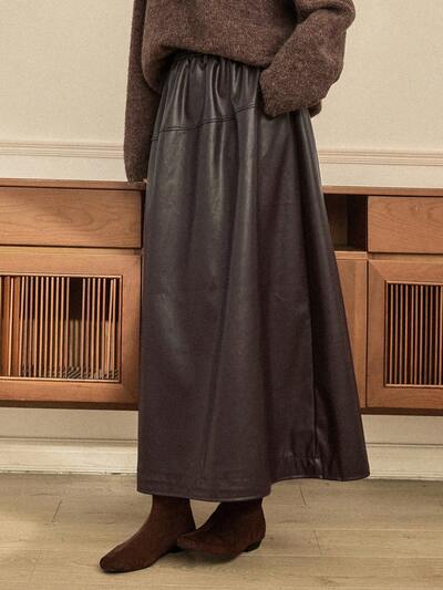 Falda de línea A de cuero sintético de cintura elástica de unicolor para mujer, de estilo empresarial y casual