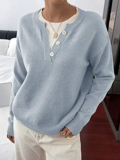 Suéter informal de cuello henley con bloques de color, suéter de punto suave 2 en 1 para mujer