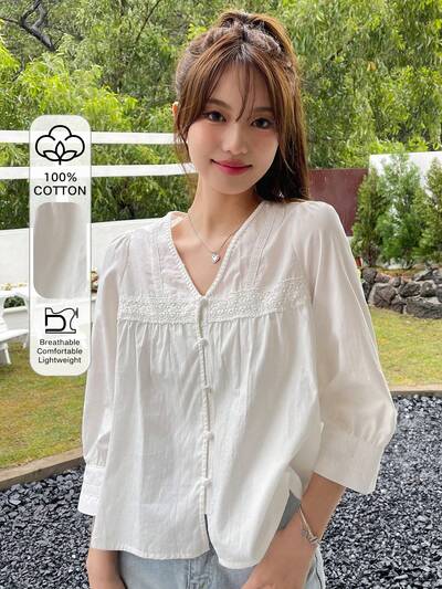 Blusa Con Botones Frontales, Manga Abullonada Y Detalle De Encaje