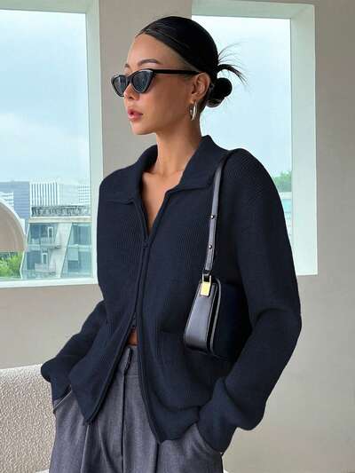 Blusa casual de manga larga con cremallera y diseño liso, chaqueta de ropa de otoño para mujer