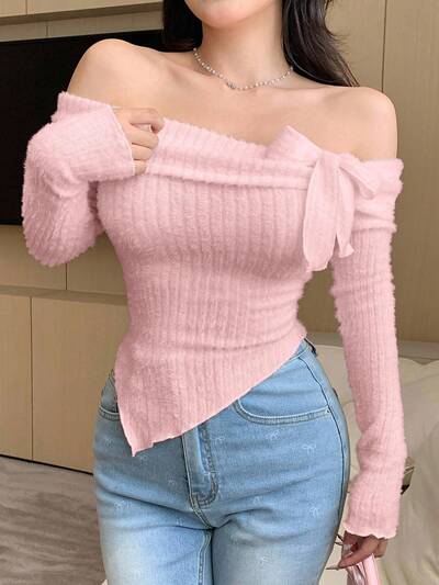 Camiseta interior casual, sexy y linda con hombros descubiertos, manga larga y ajustada con pelaje para mujer, estilo Y2K-39%