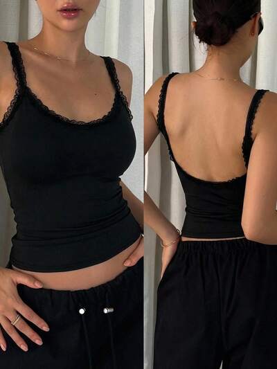 Blusa casual de diario de unicolor con ribete de encaje ajustada para mujer