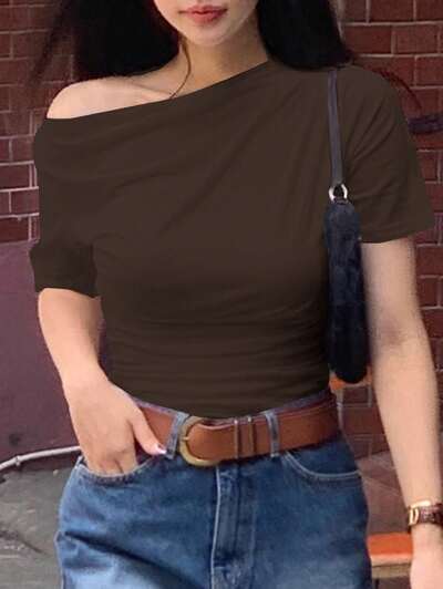 Camiseta de manga corta con hombros abiertos y fruncidos para mujer, ropa de otoño con estilo preppy-43%