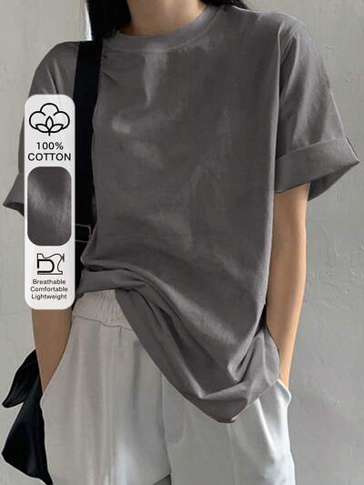 Camiseta holgada de verano para mujer, de unicolor, cuello redondo, manga corta, informal