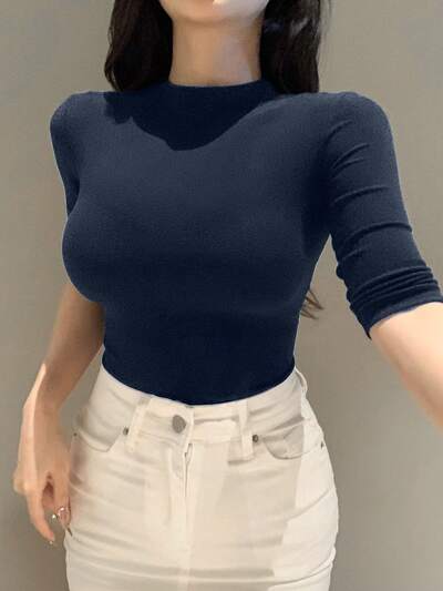 Camiseta de manga larga de corte ajustado y color liso acanalado para mujer, ropa de otoño, ropa de vuelta al colegio-37%