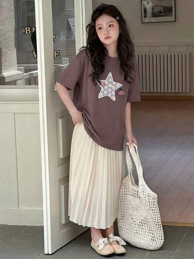 2 pièces/set Top casual à manches courtes avec imprimé lettre et col rond, et jupe pour filles préadolescentes. Tenues d'été pour filles, vêtements pour la rentrée scolaire-58%