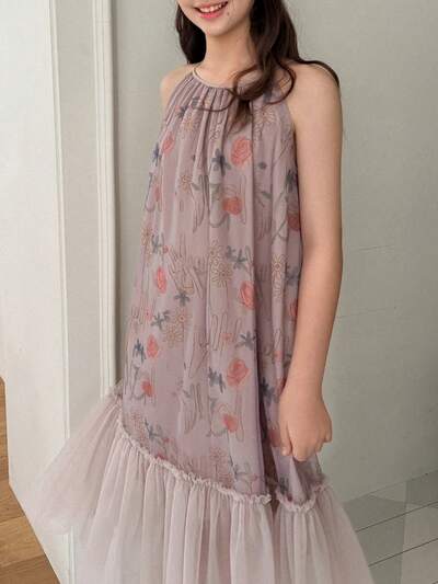 Robe d'été à col ras-du-cou avec volants et imprimé floral pour préadolescentes-56%