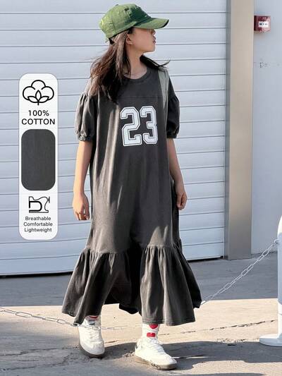 Robe à col rond, manches courtes bouffantes et volants à l'ourlet pour jeune fille avec imprimé numérique
